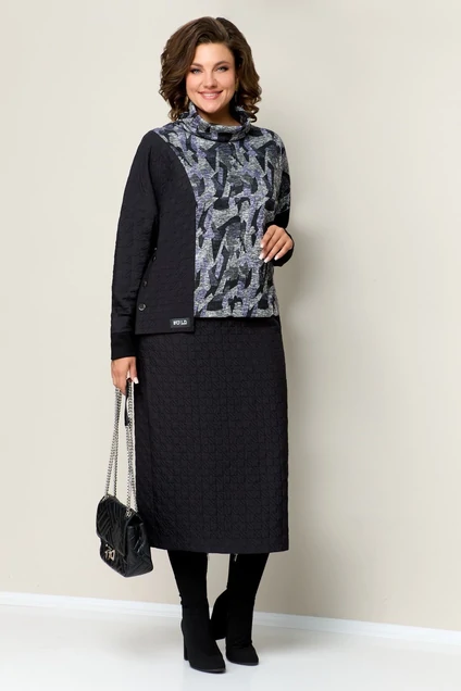 Комбинированный джемпер из трикотажа и стеганой ткани с элементами асимметрии. Горловина джемпера- мягкая стойка. Длина джемпера по центру спинки 59см. Юбка прямая из стеганой ткани с разрезом сзади. По спинке юбки- застежка на молнию и пуговицу. Длина юбки- 82 см. В поясе юбки- вставки с резинками.