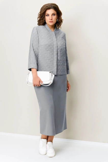 Изысканный комплект-тройка: облегченный стеганый жакет, удлиненная юбка- годе из текстиля и блуза из вискозы. Жакет полуприлегающий, с воротничком полустойка, на потайной застежке на пуговицы. Полочки жакета на подкладке.Длина жакета по центру спинки- 57 см. Рукав жакета втачной, 3/4, длина рукава- 51 см Юбка- годе сзади с застежкой на молнию и пуговицу. В поясе юбки вставки с резинками. Длина юбки - 86см. Блуза из вискозы со спущенным коротким рукавом. Длина блузы по центру спинки- 57см.