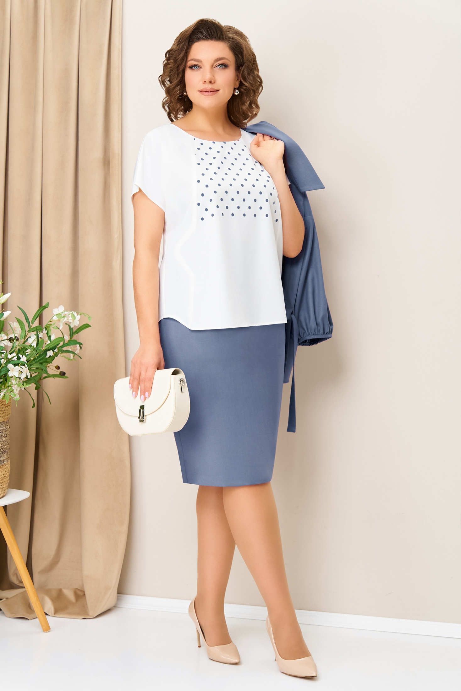 Костюм с юбкой 1425 голубой VOLNA сочетает в себе стиль и комфорт. Коллекция бренда VOLNA предлагает эффектную тройку, состоящую из жакета, юбки и легкой блузы. Жакет с воротничком и кулиской выполнен без подкладки, имеет спущенные рукава длиной 41 см и окантовку, что делает его идеальным для официальных мероприятий. Прямая юбка со шлицей дополняет образ, обеспечивая свободу движений. Длина жакета по центру спинки составляет 63 см, юбки – 62 см. Блуза из легкого текстиля с короткими рукавами украшена рисунком и имеет длину 60 см. Нежный голубой цвет костюма подходит для весны и осени, добавляя свежести в повседневный гардероб. Этот комплект идеально подходит для офисного и повседневного использования.