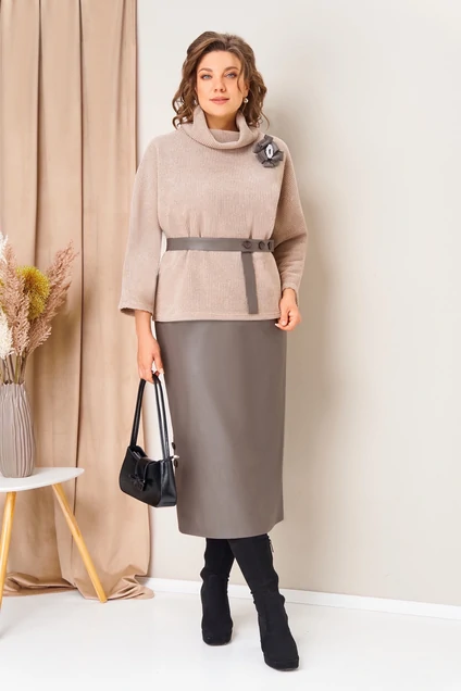 Костюм с юбкой 1447 бежевый капучино VOLNA — это стильный выбор для вашего гардероба. Коллекция бренда VOLNA предлагает уникальный комплект из трикотажного джемпера и юбки из искусственной кожи. Джемпер с мягкой стойкой и цельнокроеными рукавами обеспечивает комфорт, а длина по центру спинки составляет 59 см. Удлиненная юбка прямого силуэта с боковыми разрезами и пуговицами добавляет изюминку образу. Пояс с резинками в области талии гарантирует удобство. В комплект входит съемная брошь из кожи в форме цветка и пояс с застежкой на пуговицы. Этот нарядный костюм идеально подойдет для осени и прохладных дней благодаря своим материалам и фасону. Цвет бежевый капучино дополняет его утонченность.