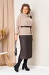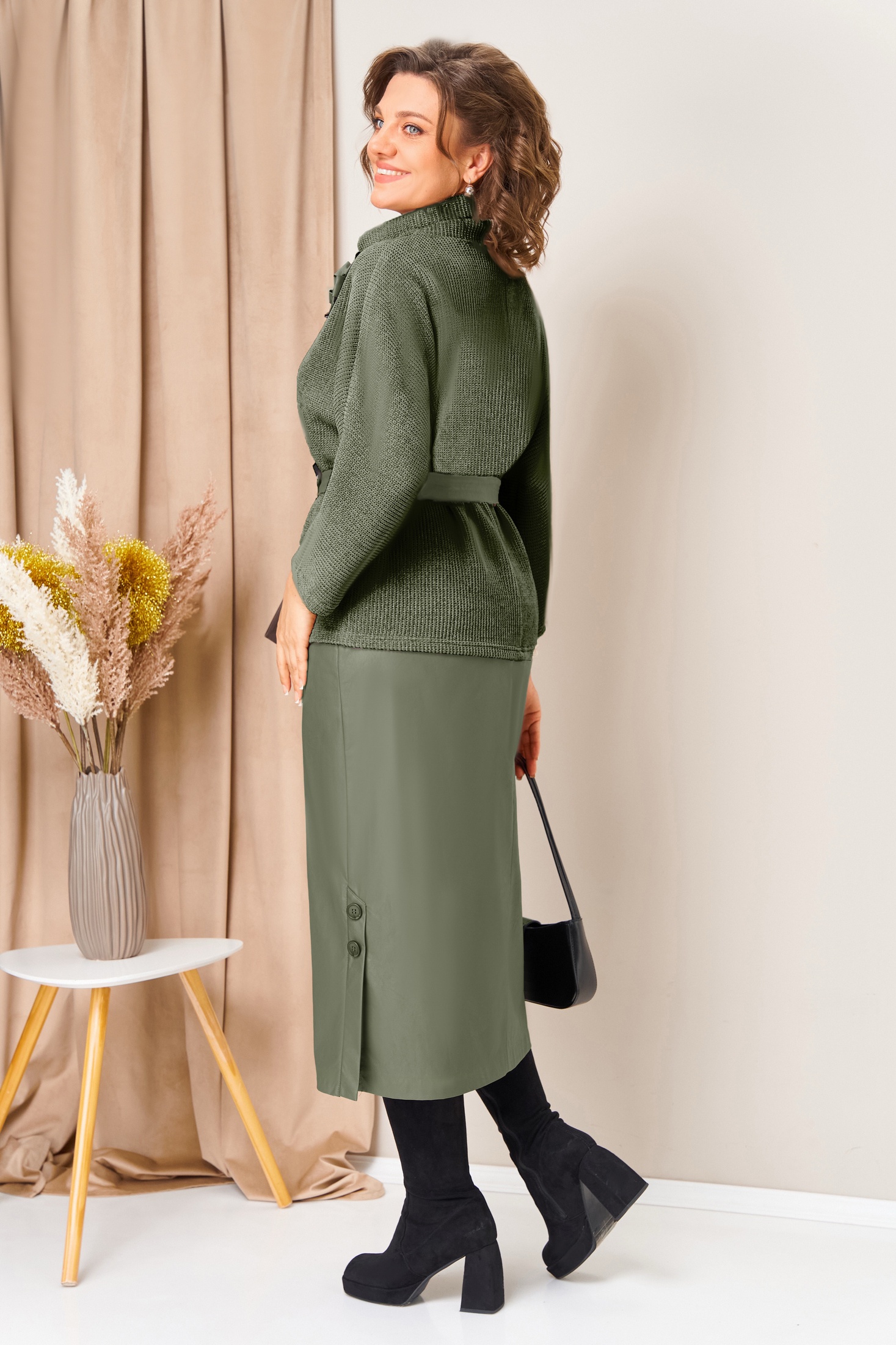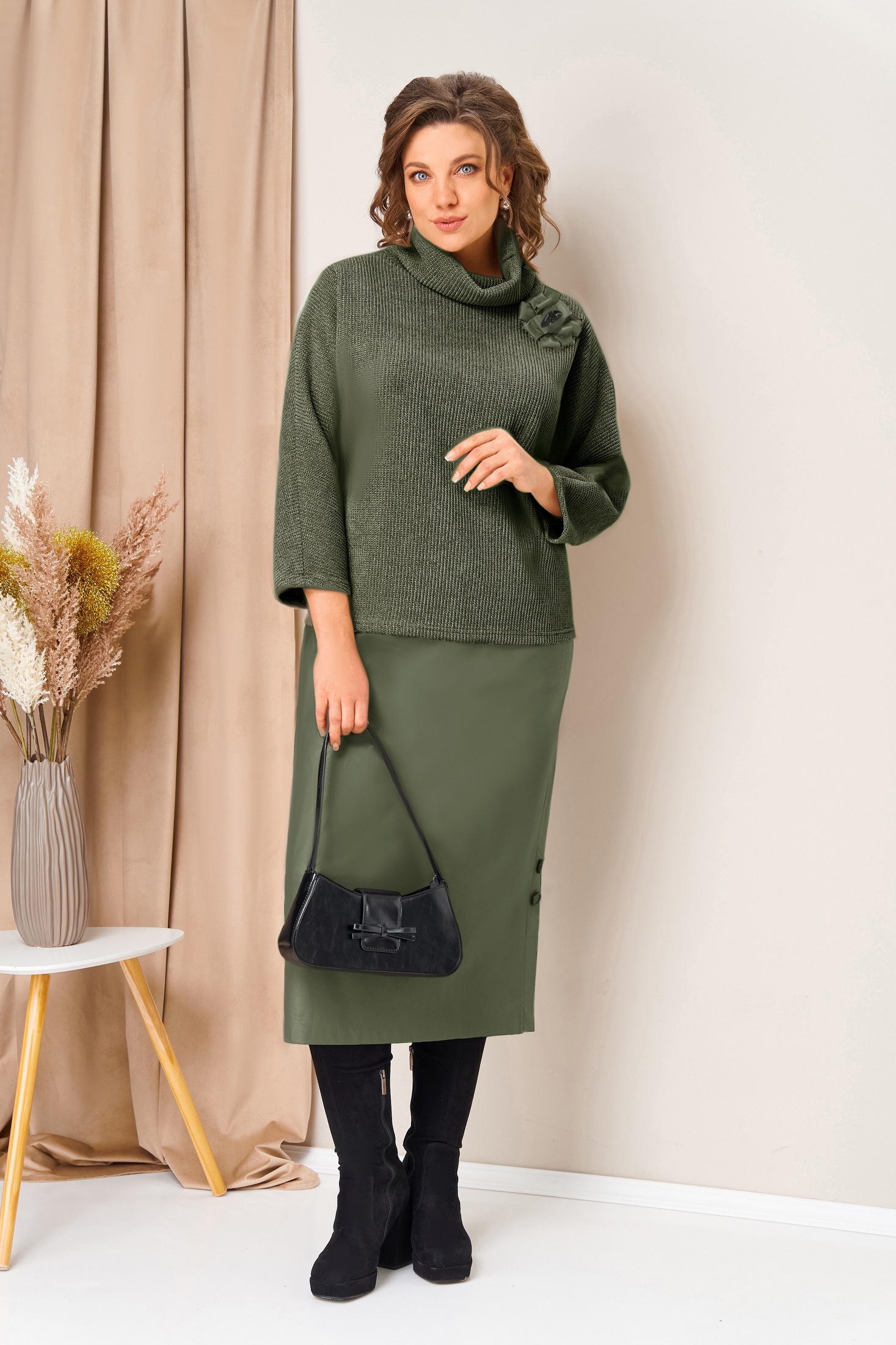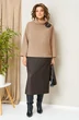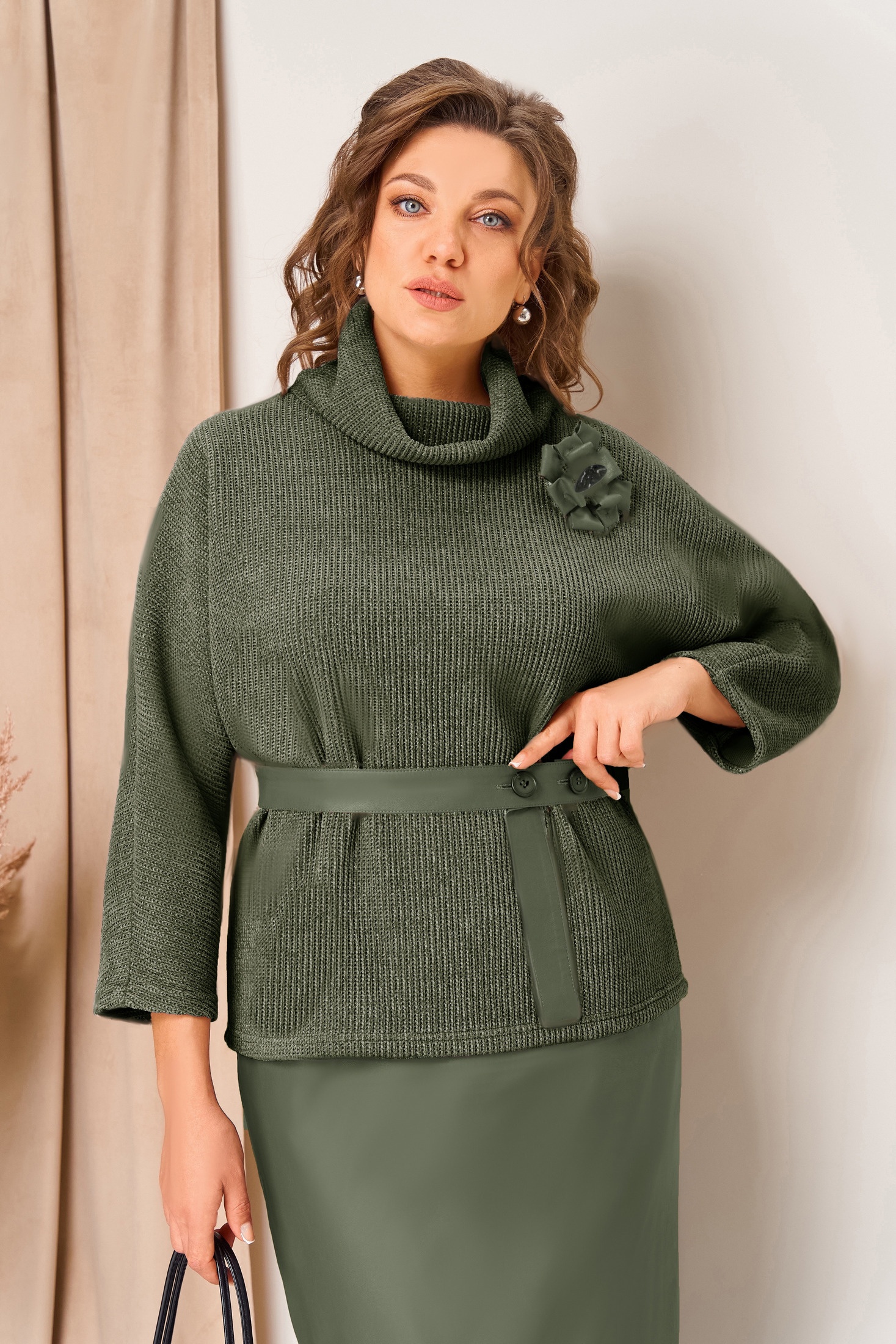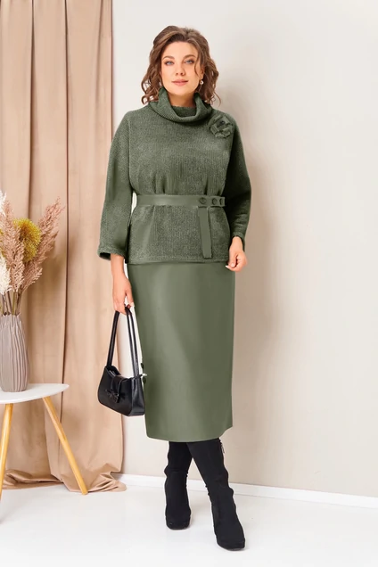 Изысканный комплект из трикотажного джемпера и юбки из искуственной кожи. Уютный джемпер с цельнокроеным рукавом и горловиной мягкая стойка. Длина джемпера по центру спинки- 59см. Удлиненная юбка прямого силуэта с разрезами по бокамс застежкой на пуговицы. Для удобства в поясе юбки вставки с резинками. Длина юбки - 87см. В комплекте изделия- съемная брошь из кожи в форме цветкка и пояс с застежкой на пуговицы.