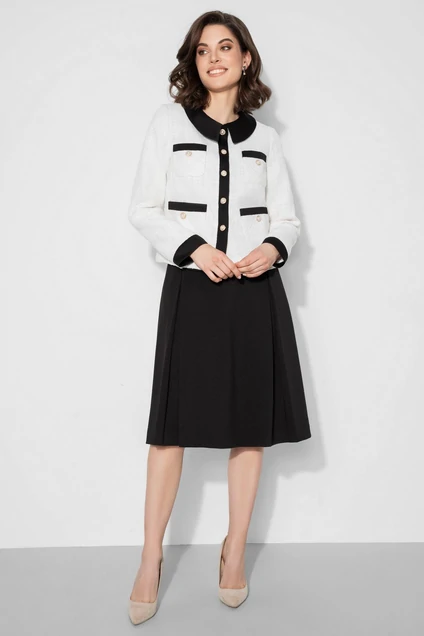 Этот стильный женский костюм с юбкой — идеальное сочетание элегантности и комфорта. Жакет из белого твида с контрастной отделкой придаёт образу изысканность, а чёрная юбка добавляет строгости и шарма. Костюм идеально подойдёт для деловых встреч, офисных будней и формальных мероприятий.