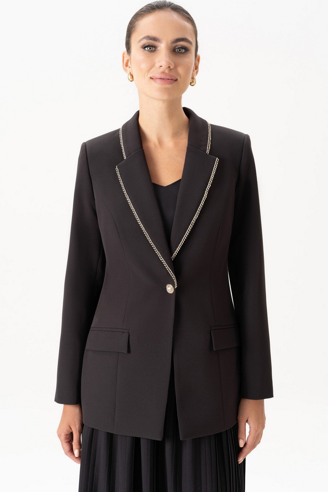 Элегантный черный комплект, который гармонично сочетает строгость и утонченность. Удлиненный жакет с идеальной посадкой, дополненный изысканной цепочной отделкой по лацканам, придает образу нотку благородства. Плиссированная юбка добавляет легкость и динамику, подчеркивая женственность и стиль. Этот ансамбль — идеальный выбор для делового ужина, торжественного мероприятия или официальной встречи. Завершите образ минималистичными аксессуарами и классическими туфлями на каблуке для создания безупречного впечатления.