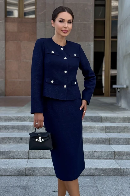 Элегантный твидовый костюм URS женский с юбкой миди — это гармоничное сочетание классики и современного стиля. Комплект состоит из жакета полуприлегающего силуэта и юбки-карандаш, выполненных в изысканном синем цвете. Такой ансамбль подчеркивает женственность и подходит для строгого дресс-кода, деловых встреч и торжественных событий. Костюм женский 2-х предметный, состоящий из жакета и юбки, выполненных из костюмной ткани "рогожка". Костюм может быть как нарядный, так и для повседневной носки.