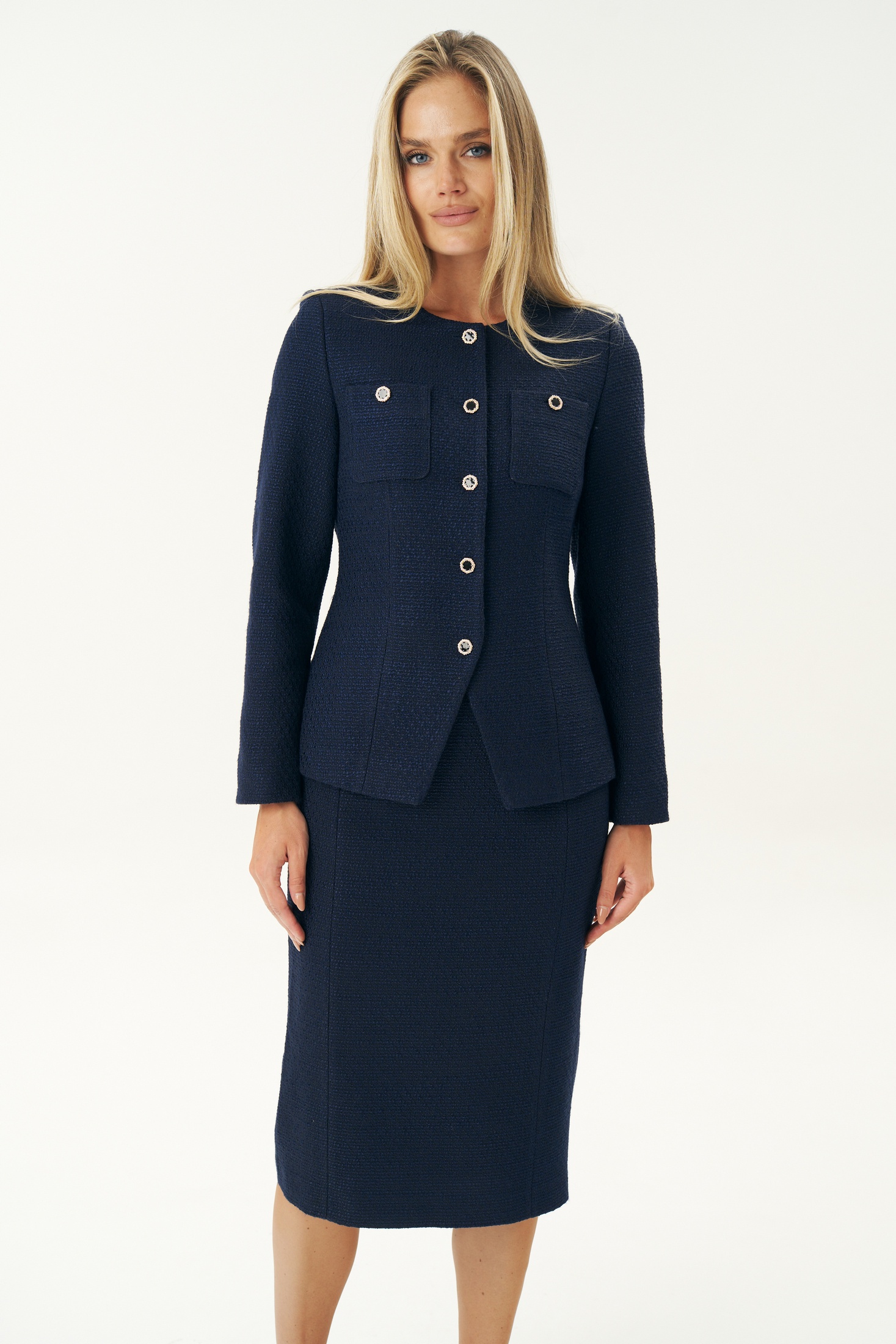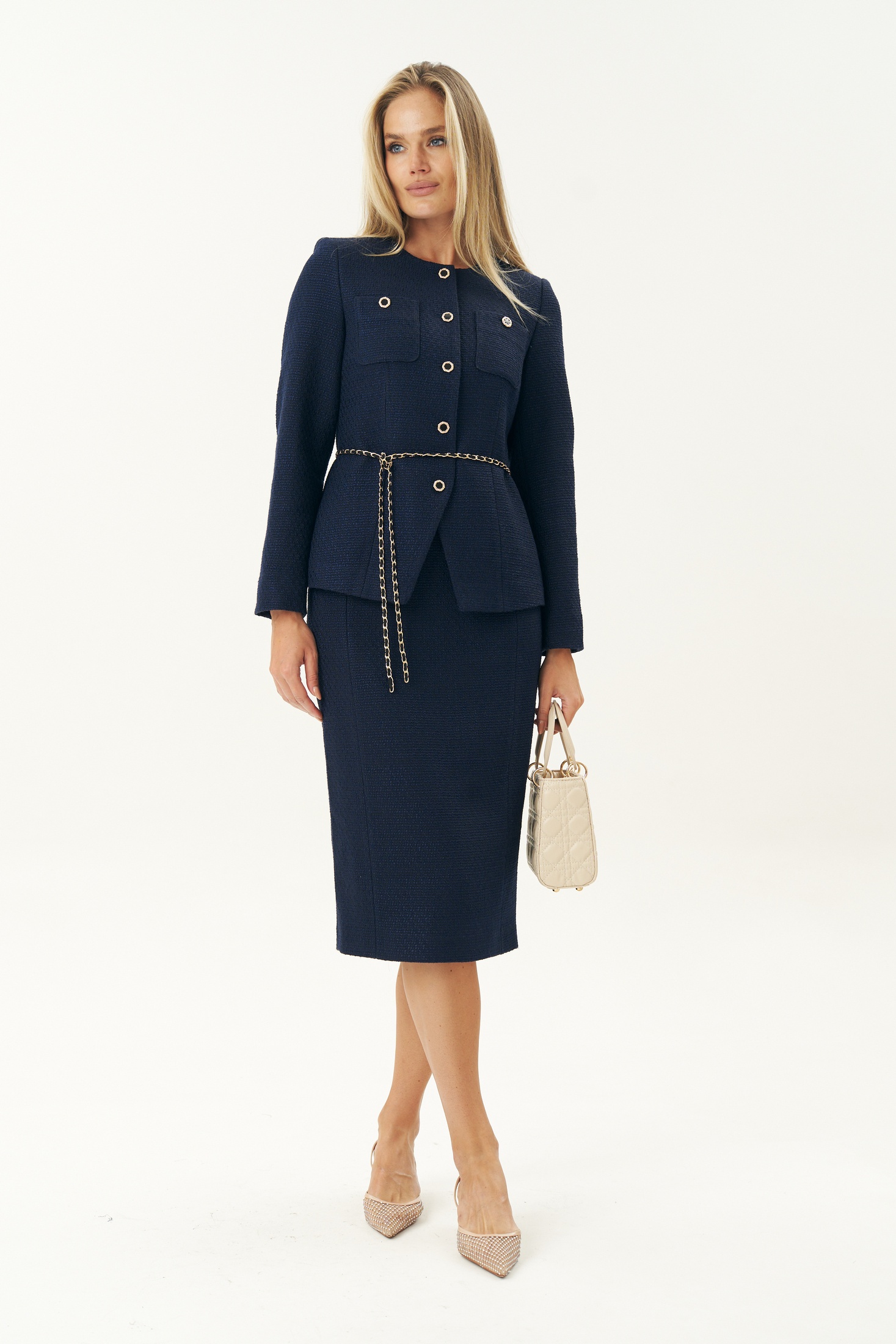 Элегантный синий твидовый костюм женский с юбкой от бренда URS создан для тех, кто ценит безупречный стиль, утонченную классику и современный деловой образ. Эта модель воплощает лучшие традиции женской одежды из твида, сохраняя узнаваемую эстетику твидовых костюмов, вдохновленных стилем Chanel, и при этом полностью соответствует требованиям современной моды, дресс-кода и офисного этикета. Костюм женский 2-х предметный, состоящий из жакета и юбки, из костюмной ткани рогожка. Костюм может быть как нарядный, так и для повседневной носки.