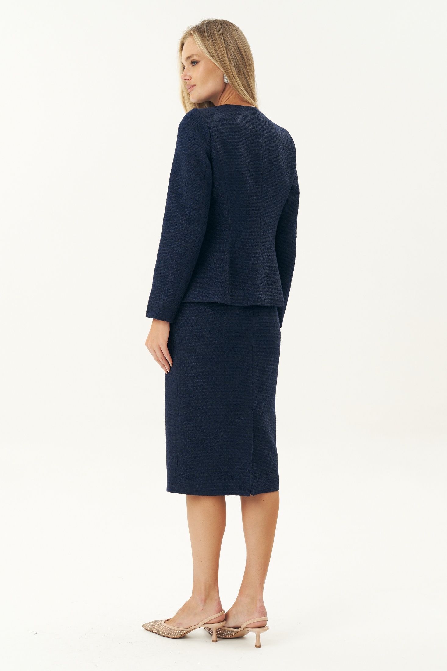 Юбка зауженная к низу, на притачном поясе, застегивающимся на 1 петлю и пуговицу. Переднее полотнище с рельефными швами. Заднее полотнище с талиевыми вытачками, со средним швом, в верхней части которого обработана застежка на потайную тесьму-молнию, в нижней – шлица. Юбка на притачной по низу подкладке. В размерах 50,52,54 в поясе на уровне боковых швов предусмотрены резинки, для лучшего прилегания по талии. Средняя длина жакета по среднему шву спинки 58,0 см, (±2,0 см);