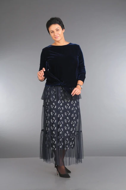 В нарядном женском комплекте блуза выполнена из бархатного трикотажа и оторочена рюшей из сетки. Юбка на подкладке выполнена из гипюра и сетки. Пояс в юбке выполнен из декоративной резинке. Длина блузки по спинке (бархатная часть) 52см , длина рукава 62см. Длина юбки (по гипюру) 71см.