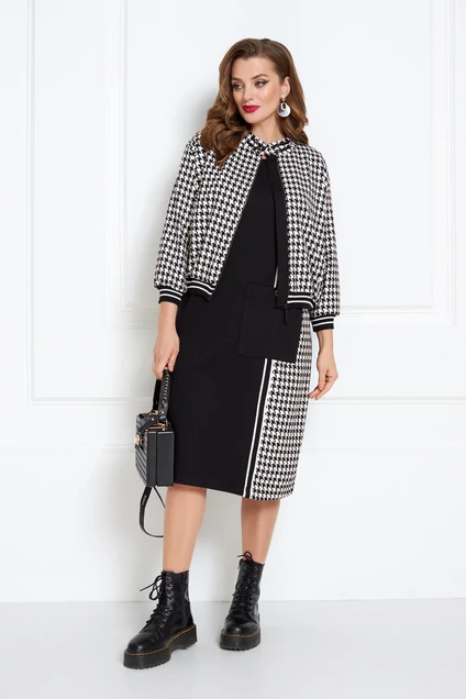 Стильный женский комплект, состоит из бомбера и платья. Бомбер выполнен из высококачественной ткани с добавлением вискозы с принтом гусиная лапка. Бомбер прямого силуэта, по переду с застежкой на металлическую молнию, рукава и низ бомбера декорированы стильным трикотажным довязом. Платье полуприлегающего силуэта, выполнено из высококачественной трикотажной ткани с добавлением вискозы, по переду декорировано вставкой из ткани с принтом гусиная лапка, накладным карманом с застежкой на пуговицу и отделочной тесьмой. Модель прекрасно подойдет для деловой встречи и ежедневной носки, вы будете в нем выглядеть неотразимо и роскошно.