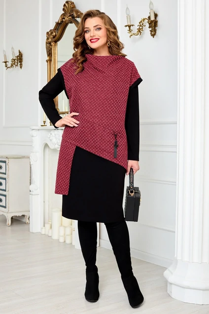 Стильный женский комплект, состоит кардигана и платья. Кардиган выполнен из высококачественной трикотажной ткани с добавлением вискозы. Кардиган прямого силуэта, слегка расклешен к низу, с отрезной баской по переду и карманом декорированным съемным дизайнерским украшением. Воротник хомут, пройма рукава с отделкой из однотонного черного трикотажа. Низ кардигана ассиметричный, что придает модели особый стиль и изящность. Платье полуприлегающего силуэта, выполнено из трикотажной ткани с добавляем вискозы, по спинке потайная молния. Рукав втачной, горловина платья с округлым вырезом. Комплект удобный и практичный, отлично подойдет для ежедневной носки, вы будете выглядеть неотразимо и роскошно.