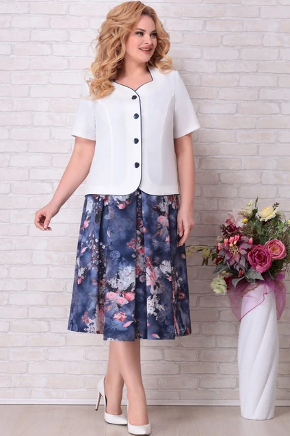 Жакет без подкладки, с плечевыми накладками, по низу отделан черным кантом, застегивается на декоративные пуговицы. Перед с нагрудными вытачками. Длина по спинке 59 см, длина рукава 30 см.