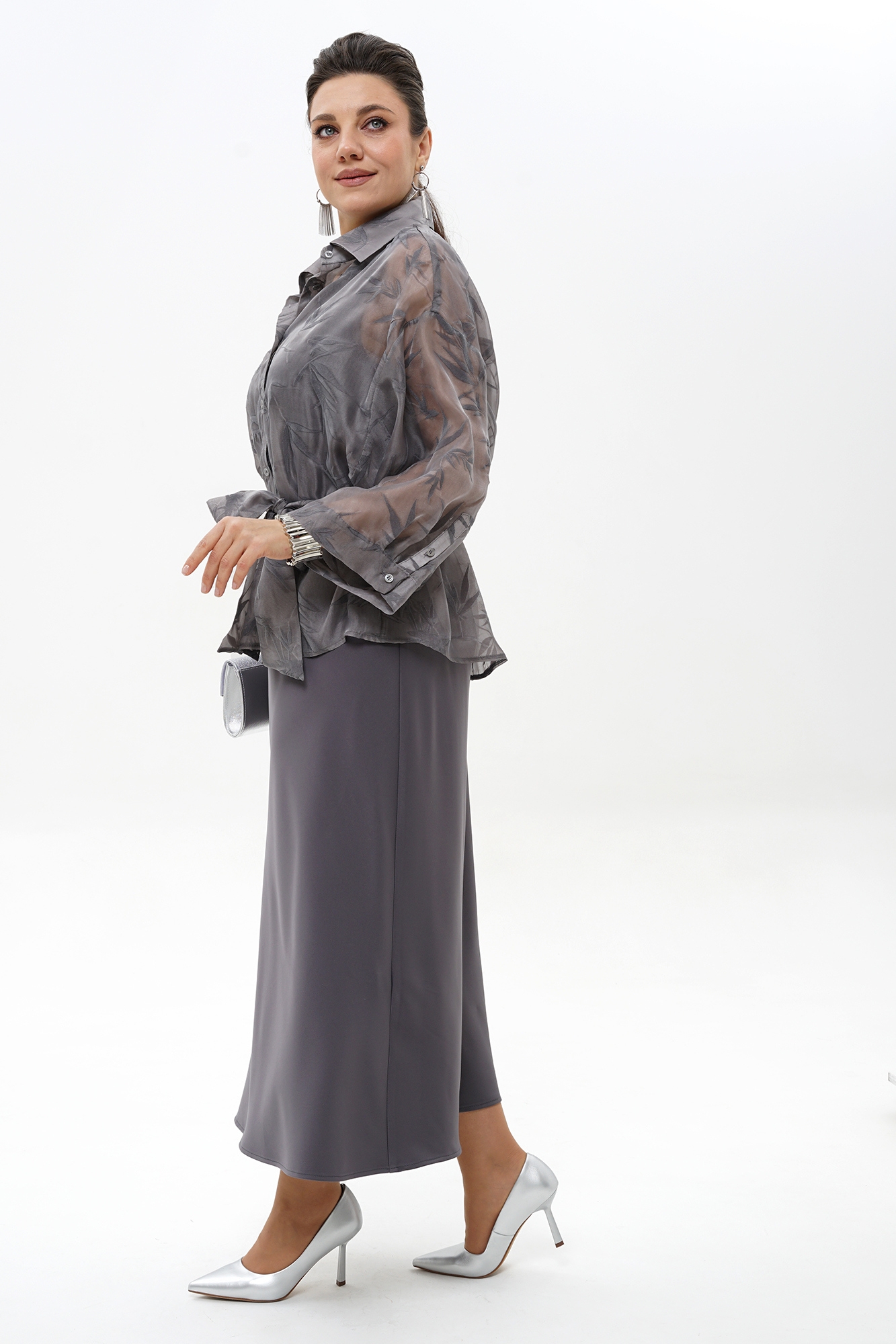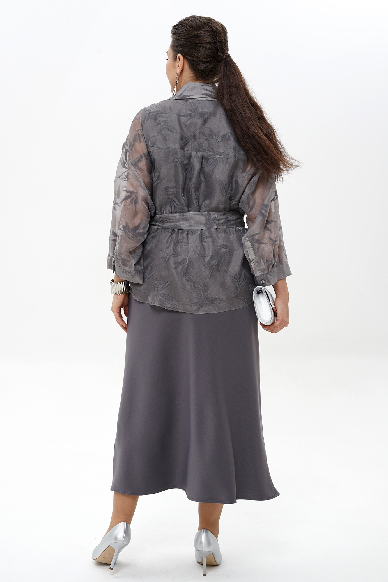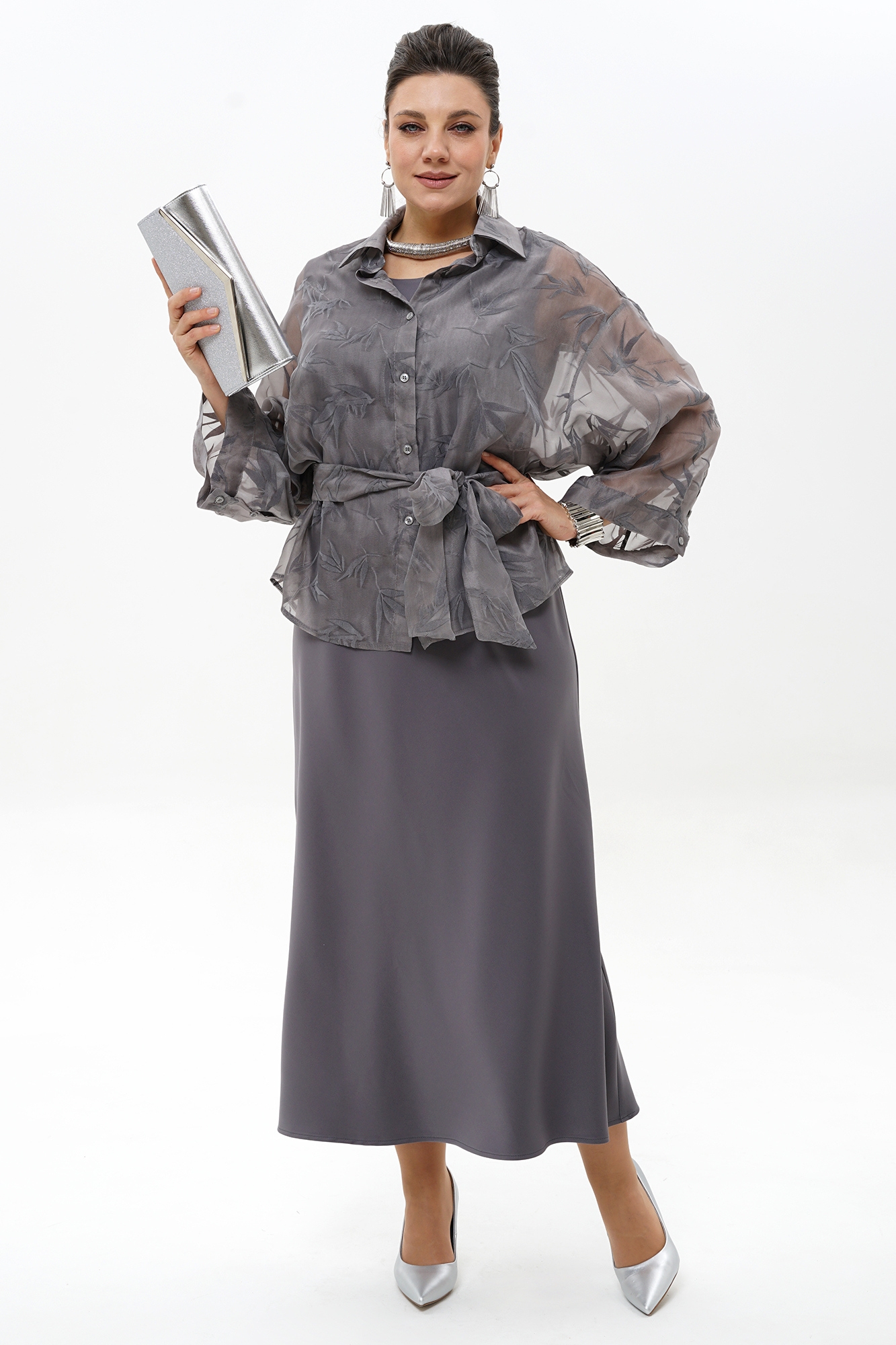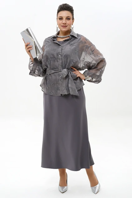 Костюм с платьем 2429 ALANI – идеальное решение для тех, кто ценит комфорт и стиль. Коллекция бренда ALANI предлагает женский комплект из блузки и платья, выполненный из органзы и полиэстера с добавлением вискозы и спандекса. Прозрачная блузка свободного покроя с завязывающимся поясом и элегантными манжетами отлично подходит для весенне-летнего сезона. Платье полуприлегающего силуэта, раскроенное по косой, изысканно подчеркнёт фигуру и обеспечит комфорт в течение всего дня. Спинка блузки украшена притачной кокеткой и бантовой складкой, а цветовое решение – благородный серый – добавит изысканности вашему образу. Этот комплект станет отличным выбором для деловых встреч и вечерних мероприятий.