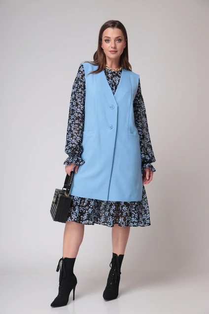 Костюм женский, состоящий из жилета и платья. Жилет без подкладки полуприлегающего силуэта с центральной застежкой на 2 пуговицы, перед с вертикальными рельефами и прорезными карманами с листочками, спинка со средним швом и отрезными бочками, по низу боковых швов выполнены разрезы. Платье из шифона на трикотажной подкладке свободного покроя с горизонтальными подрезами в верхней части, притачным воланом по низу и втачными рукавами с подрезами в верхней части, внизу собранными в несколько рядов на тонкую венгерку.