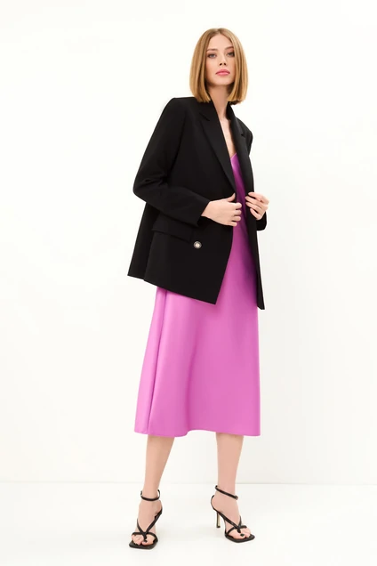 Комплект состоит из жакета на подкладке и платья. Жакет свободного силуэта. С воротником пиджачного типа. Застежка двубортная на четыре петли и пуговицы. Полочка с рельефными швами. Ниже линии талии настрочены клапаны. Спинка со средним швом и рельефами. Рукав втачной двушовный. Платье А- образного силуэта. Полочка с двумя нагрудными вытачками. Фигурная горловина полочки обработана обтачкой. Спинка с двумя талевыми вытачками, верх окантован. Платье на регулируемых бретелях. Фурнитура может быть изменена. Длина жакета-71 см, рукава- 63см., платья- 96 см.