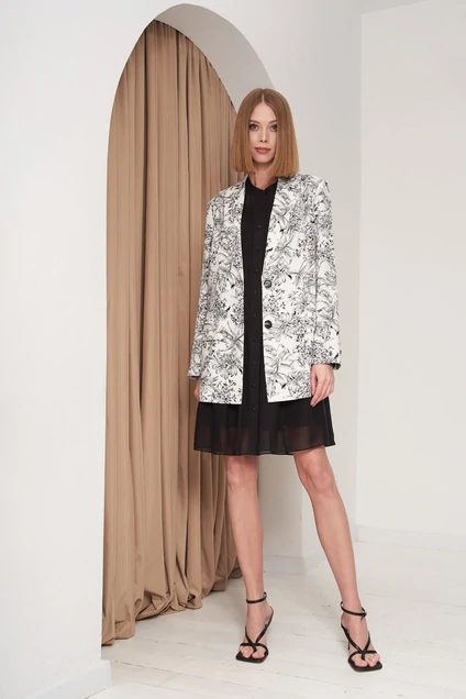 Костюм состоит из жакета и платья. Жакет прямого силуэта с однобортной застежкой на 2 петли и пуговицы и воротником пиджачного типа. Перед с талиевой вытачкой, рельефом и настрочным клапаном. Спинка с рельефом и средним швом. Рукав втачной двухшовный со шлицей внизу рукава с двумя пуговицами. Шифоновое платье свободного силуэта. Перед с застежкой в виде планки, которая застегивается на 11 петель и пуговиц. Перед состоит из трех деталей. Средняя деталь присобрана на кокетку. По низу средней детали присобран волан. Спинка также состоит из трех деталей. Средняя деталь также присобрана на кокетку спинки. По низу средней детали присобран волан. Рукав втачной, низ рукава присобран на манжету, которая застегивается на три петли и пуговицы. По горловине обработан воротник стойка. К платью прилагается нижнее платье. Фурнитура может быть изменена. Длина жакета 76 см. Длина рукава 62 см. Длина платья 92 см.