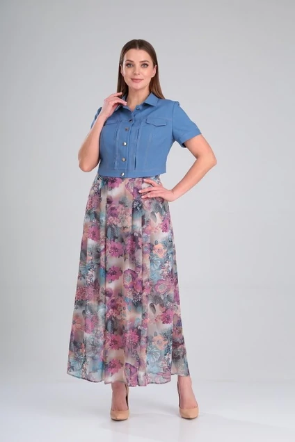 Комплект состоит из сарафана и жакета.В сарафане в боковом шве молния,а также молния по центру груди декоративная металлическая.Юбка сарафана из цветного шифона на подкладке.Жакет укороченный на пуговицах,рукав на манжете с застёжкой на пуговицу.