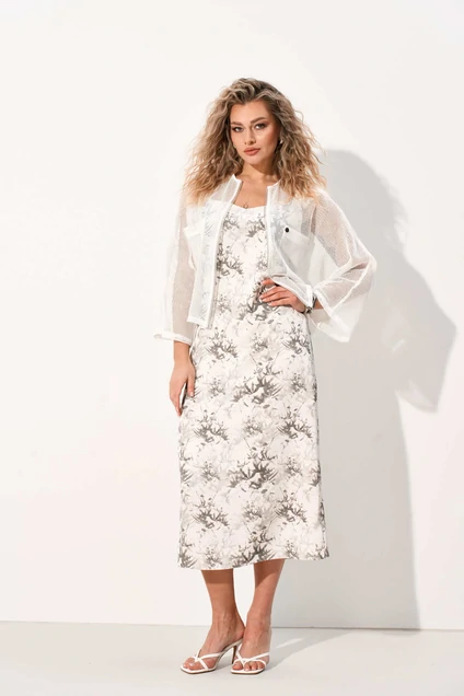 Костюм с платьем 1114 AMUAR от коллекции бренда AMUAR представляет собой гармоничное сочетание стиля и комфорта. Платье миди полуприлегающего силуэта выполнено из легкой сатиновой ткани с добавлением полиэстера, вискозы и спандекса, что обеспечивает его прочность и эластичность. Фигурный вырез горловины акцентирует внимание на линии декольте, а выточки добавляют женственности. Платье без рукавов дополняется бомбером из сетки на основе хлопка, свободного силуэта с центральной застежкой на молнию и накладными карманами. Длина рукава бомбера 7/8, что делает комплект идеальным для теплой весны или прохладного лета. Цветочная расцветка приносит в облик свежесть и легкость. Этот костюм — отличный выбор для прогулок и повседневных выходов.