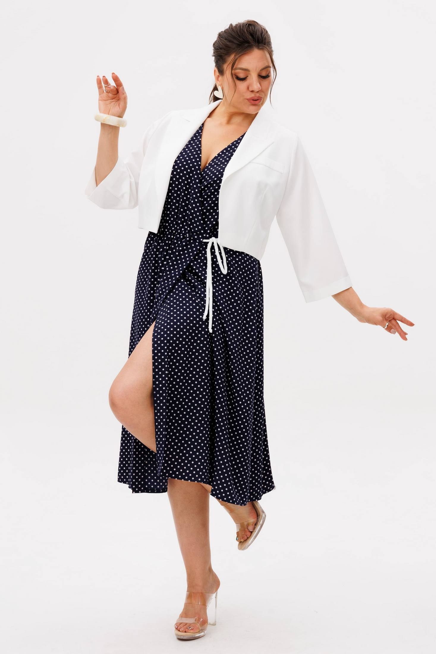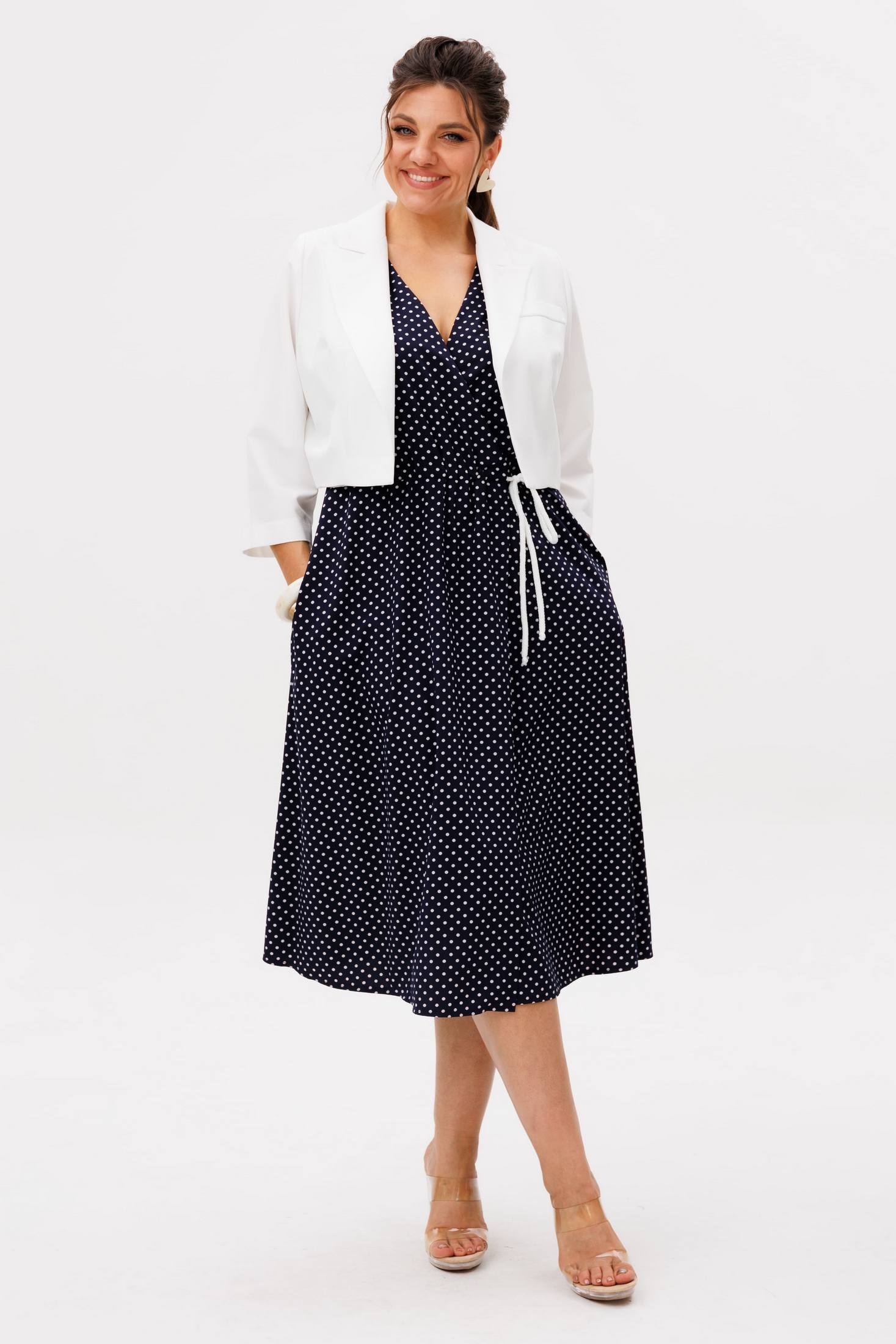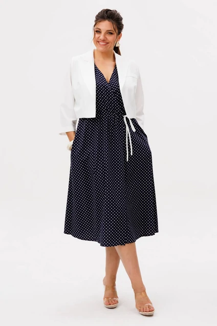 Костюм с платьем 1708 чия пудинг Anelli – это воплощение женственности и утонченности, созданное из лёгкого материала, который идеально подходит для межсезонья. Коллекция бренда Анелли предлагает платье на запах с очаровательным горошковым принтом в кремовом оттенке. Длина ниже колена подчеркивает ваш силуэт, добавляя комфорт и уверенность при каждом шаге. Платье изготовлено из мягкой вискозы, которая струится при движении, создавая романтичное настроение. Кроп-жакет с рукавами 3/4 и пояс на кулиске добавляют наряду завершённость и стильную деталь в виде декоративной листочки. Модный и классический стиль делает этот комплект идеальным выбором для любого повседневного или делового случая.