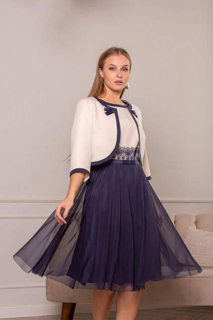 Шикарный костюм женский (платье, жакет-болеро). Платье приталенного силуэта длинной до колена с кружевом, жакет укороченный украшен декоративной тесьмой. Костюм полностью на подкладке. Подкладка: вискоза 74%, полиамид 26%.