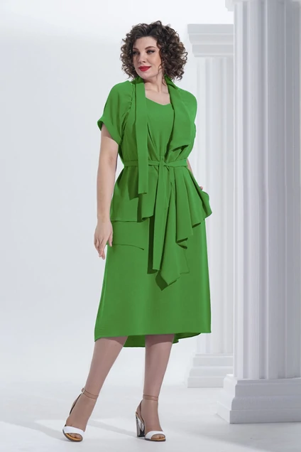 Комплект двойка: платье+жилет. Легкое летящее платье полуприлегающего силуэта. Перед чуть короче спинки по модели. Ткань немного тянется, не мнется. В боковых швах удобные карманы. Талия собрана на широкую резинку. Рукав цельнокроенный. Жилет ассиметричного кроя, завязывается спереди на пояс. Ткань такая же как в платье. Длина 120 см. Длина жилета 66 см.