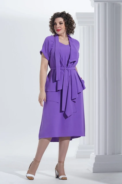 Комплект двойка: платье+жилет. Легкое летящее платье полуприлегающего силуэта. Перед чуть короче спинки по модели. Ткань немного тянется, не мнется. В боковых швах удобные карманы. Талия собрана на широкую резинку. Рукав цельнокроенный. Жилет ассиметричного кроя, завязывается спереди на пояс. Ткань такая же как в платье. Длина платья 120 см, жилета - 66 см.