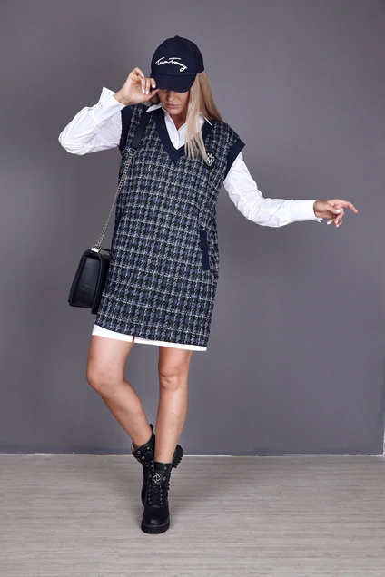 Комплект женский, состоящий из жилета и блузы. Жилет из трикотажного полотна с дизайном свободного покроя со спущенной проймой ,вырез горловины глубокий V-образный с планкой из довяза ,по пройме –планки из довяза,по пройме-планка из довяза,по переду втачные карманы с листочкой из довяза. В верхней части переда нашивка. Блуза удлиненная с втачным рукавом на манжете по низу рукава ,воротник рубашечный на стойке ,застежка спереди на планку с пуговицами ,по переду и спинке-вертикальные рельефы.