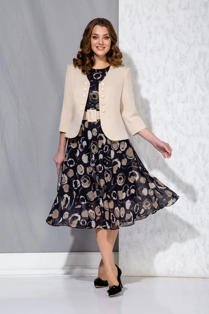Жакет однобортный, на подкладке, приталенного силуэта. Передняя часть жакета с двумя боковыми рельефными подрезами. Спинка разрезная по среднему шву и двумя дополнительными вертикальными рельефами и горизонтальным подрезом в виде баски на уровне талии. Рукав 3/4, двухшовный, втачной. V-образный вырез горловины. Застежка отсутствует. Вдоль борта, с двух сторон располагаются пуговицы, которые придают изделию дополнительную элегантность и акцент. В комплекте с жакетом предлагается шифоновое, романтическое платье.