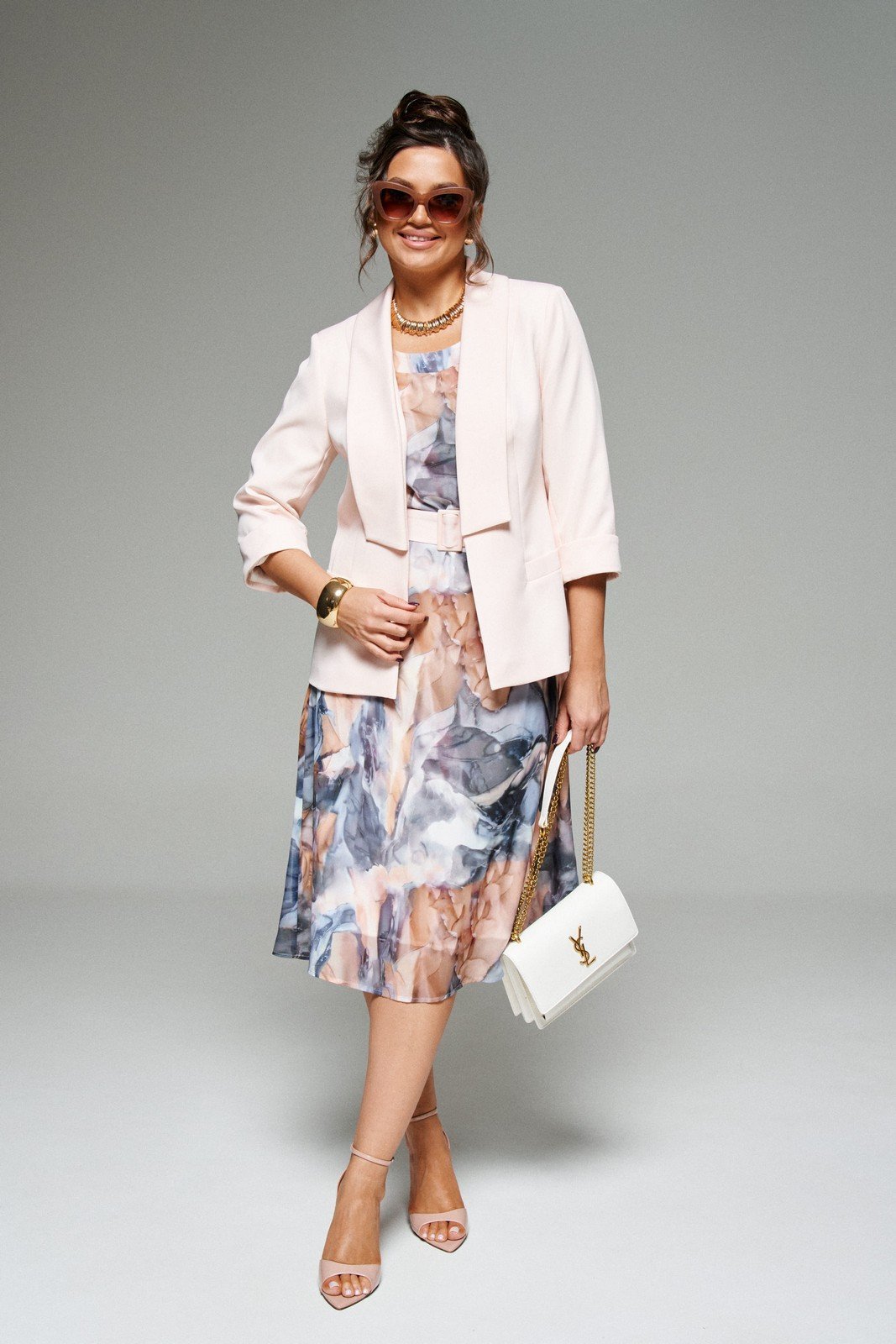 Состав: жакет – вискоза - 60%; полиэстер – 37%; спандекс – 3% платье – полиэстер–75% вискоза – 25%;