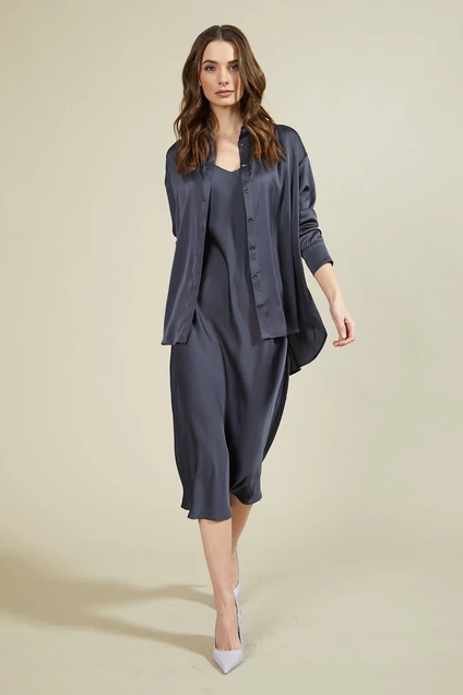Комплект состоящий из струящегося атласного платья и блузки. Блузка прямого силуэта со спущенной линией плеча. Рукав втачной длинный с притачной манжетой и складкой. Застёжка на потайную планку с пуговицами. Воротник отложной на стойке. Спинка рубашки с кокеткой и широкой складкой по центру. Низ рубашки фигурный, спинка длиннее переда. Платье полуприлегающего силуэта. Полочка с нагрудной вытачкой. Верхняя часть платья на широкой обтачке. Платье на регулируемых бретелях. Очень элегантный и обворожительный коктейльный комплект, который состоит из базовых вещей, которые идеально впишутся в любые образы.