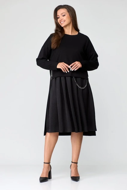 Разно фактурные материалы создают единый экстравагантный ансамбль из двух элементов одежды: туника и платье. Удлиненная разно уровневая блузка - туника выполнена из трикотажного полотна в меру плотного и комфортного. Свободного силуэта. С округлой горловиной, обработанной воротником – бейкой . Линия плеча приспущена, рукав притачной длинный, что обеспечивает комфорт и не сковывает движений при носке. Низ переда с притачной манжетой.. Легкое , воздушное платье с завышенной талией выполнено в стиле платье-«татьянка» . Лиф платья из 100% трикотажной вискозы. Ее эластичность позволяет комфортно облегать тело. Струящийся , пышный, собранный в складки низ платья из итальянского атласа придает женственность и романтичность образу . Оригинальностью и трендовым акцентом служат: металлические декоративные молнии по бокам туники и съемная массивная цепь на платье. Простой крой и элегантный силуэт не оставит равнодушными многих модниц!