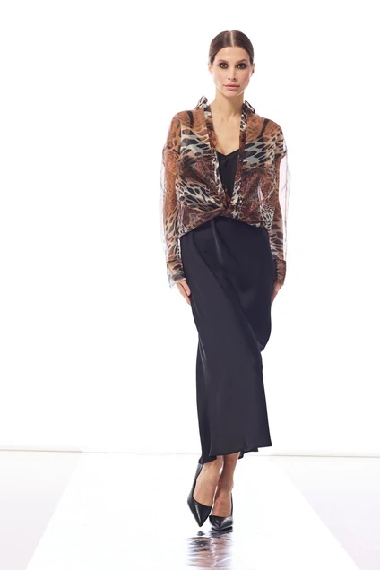 Комплект женский , состоящий из блузы , выполненной из принтованной органзы и платья -комбинации из искусственного шелка . Рукав в блузке втачной одношовный с притачной манжетой . Воротник рубашечного типа , застежка центральная на петли и пуговицы .