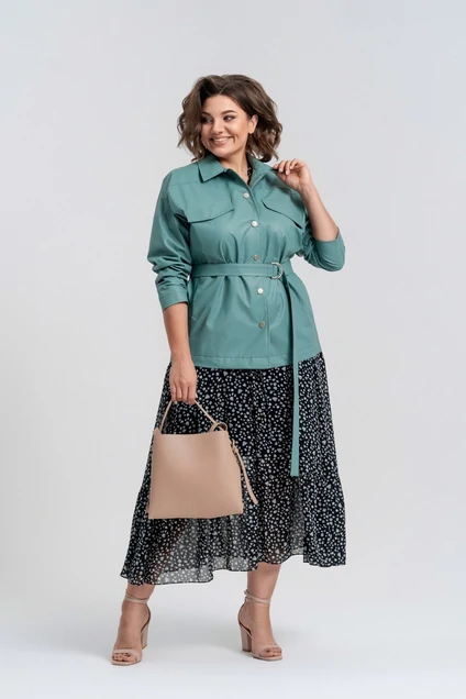 Комплект женский двухпредметный. Куртка-рубашка из ткани под "кожу"свободного покроя с застежкой на кнопки и декоративными строчками. Вырез оформлен отложным воротником. Рукава на базе цельнокроеных с декоративными подрезами. На полочках декоративные клапаны, в рельефах имеются функциональные карманы. На спинке - кокетка. Длина по спинке - 63 см, длина рукава от горловины - 62 см. Платье женское свободного покроя из шифона на мягкой трикотажной подкладке. Вырез горловины V-образной формы. Рукав втачной, по низу присборен на эластичную тесьму. По линии талии отрезное с кулисой и шнуром из основной ткани. В боковых швах функциональные карманы. По низу платья отрезной волан со сборкой. Длина изделия - 127 см, длина рукава от горловины - 54 см. Платье: ПЭ-100%