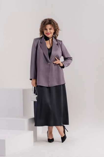 Комплект женский двухпредметный. Жакет прямого силуэта из атласной ткани. Застежка однобортная на петлю с пуговицей. Воротник - пиджачного типа. Рукава втачные двухшовные. Платье- комбинация А-силуэта из атласной ткани, без рукава. Вырез горловины V-образный.
