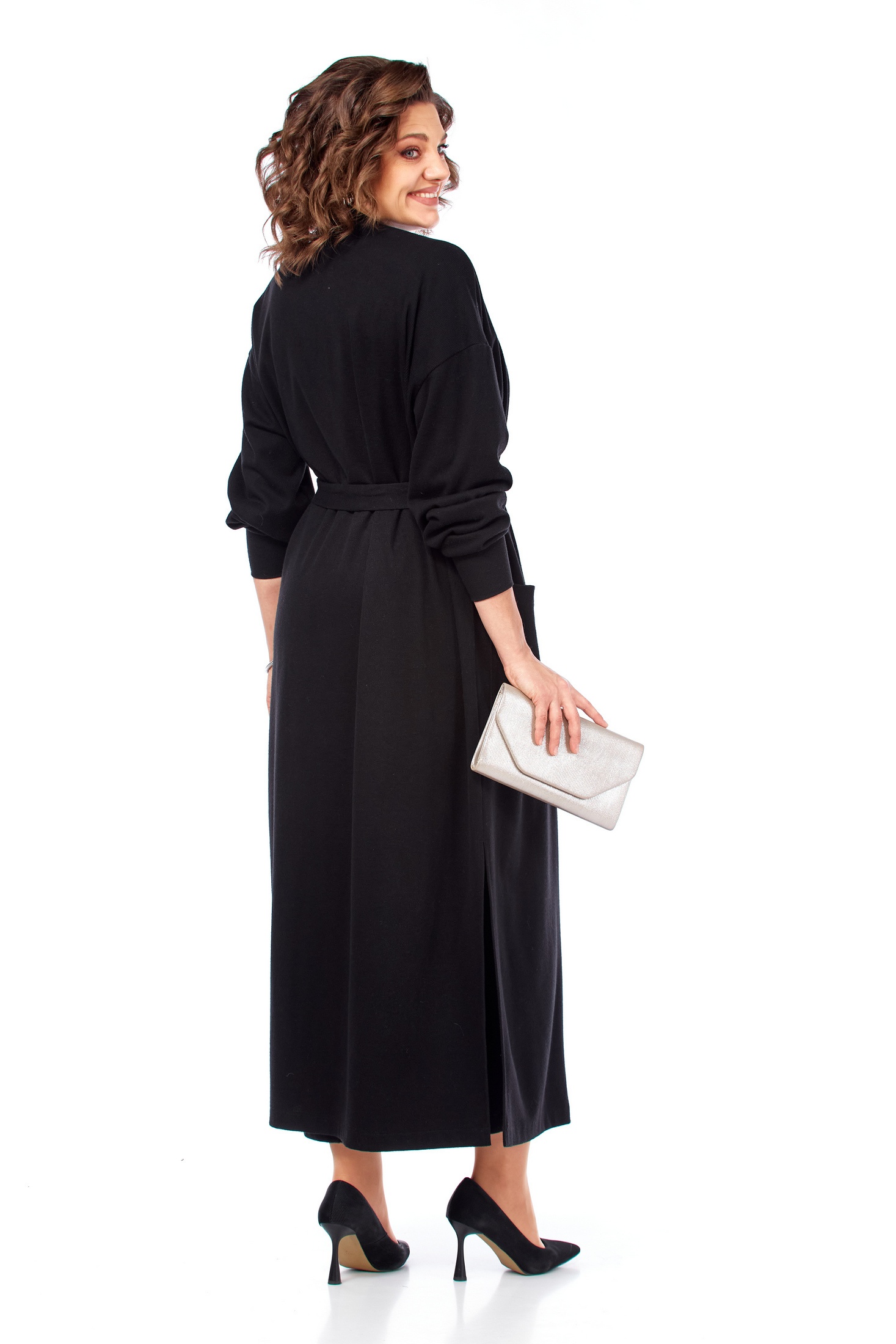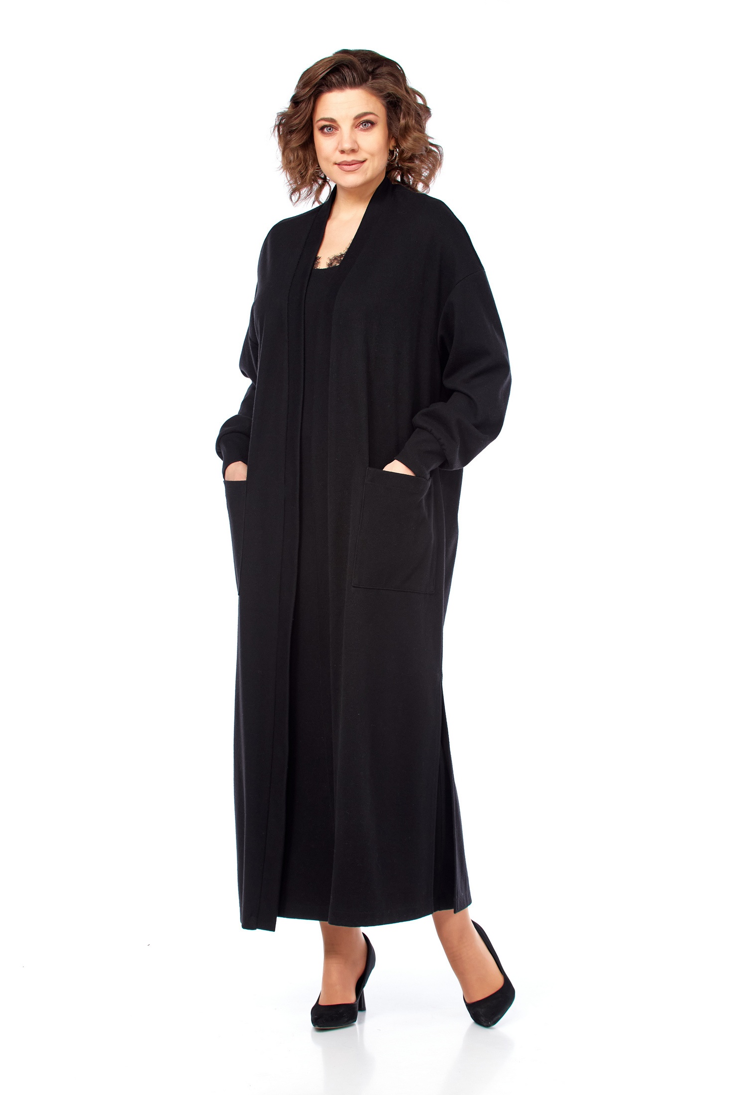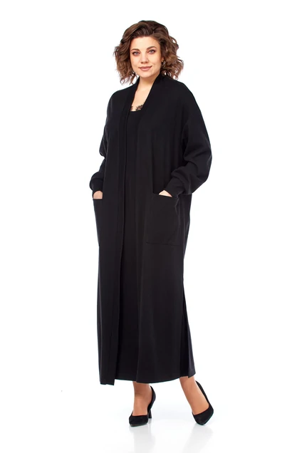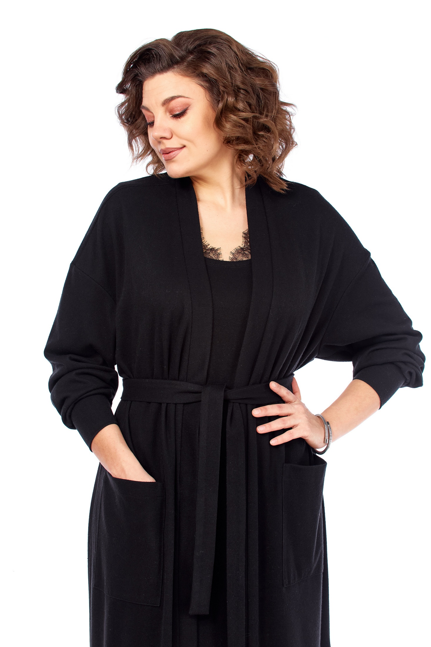 Костюм с платьем 2145 Diamant от коллекции бренда Diamant включает в себя изящное платье и длинный кардиган. Выполненный из мягкой и приятной вискозы с добавлением полиэстера, костюм обеспечивает комфорт и стиль. Платье полуприлегающего силуэта с декоративным разрезом сбоку и кружевным украшением, а округлая горловина добавляет элегантности. Кардиган с манжетами и боковыми разрезами подчеркивает современный стиль, а съемный пояс позволяет создать индивидуальный образ. Универсальный черный цвет и минималистичный дизайн делают этот комплект идеальным выбором для повседневной носки в более прохладные сезоны.