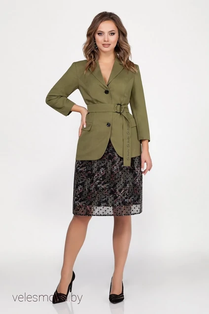 Жакет полуприлегающего силуэта, длиной до линии бедер. Спинка со средним швом и рельефами из проймы. Перед с центрально – бортовой застежкой на 3 – пуговицы и воротником пиджачного типа. Вертикальными рельефами из проймы, переходящими в карман с клапаном и одной обтачкой. Край борта закругленной формы. Перед жакета на подкладке. Талия может фиксироваться поясом из основной ткани. По одному концу пояса нанесена печать в виде слов. Рукава втачные, двухшовные, длиной ¾.