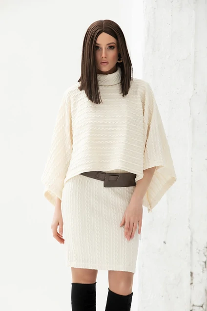 Копмлект (пончо+платье). Выполнены из неплотной трикотажной ткани. Платье на подкладке с коротким рукавом. Пончо с воротником под горло. Длина пончо по передней части от воротника до низа 45 см. Длина платья 98 см, рукав 21 см.