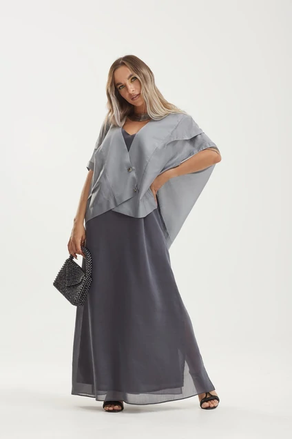 Комплект женский, состоящий из платья и блузона. Платье А-образного силуэта, на хлопковой подкладке. Вырез горловины V-образный. Перед со складками, выходящими из плечевого шва и подрезом. Спинка с подрезом. Левый боковой шов оканчивается разрезом. Блузон дизайнерского кроя. Линия плеча цельнокроеная, спущенная, со складками, переходящими на перед и спинку. Спинка со средним швом и складкой. Застёжка блузона на петли и пуговицы на планке. Правый боковой шов с мягкой складкой. Низ блузона разноуровневый, фигурный.