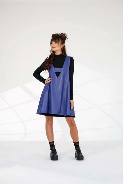 Комплект женский, состоящий из платья и сарафана. Платье прилегающего силуэта, выполнено из трикотажного полотна. Рукав втачной. Воротник- стойка. Сарафан силуэта "трапеция", на подкладке. По переду рельефы с карманами в них. По переду и спинке перемычка. Низ сарафана разноуровневый. Платье: вискоза 45%, ПЭ 39%, нейлон 16%