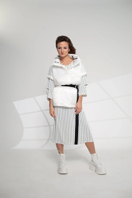 Комплект женский, состоящий из жилета и платья. Платье прямого силуэта, со спущенной линией плеча. Рукав втачной, с декоративным подрезом. Горловина V-образная. В боковых швах карманы и разрезы. Жилет прямого силуэта, с застежкой на навесные петли и пуговицы. Перед с подрезом и карманом в нём. Пройма с манжетами. Воротник-стойка. Жилет утеплен синтепоном плотностью 100 гр. В комплекте пояс из ременной тесьмы.