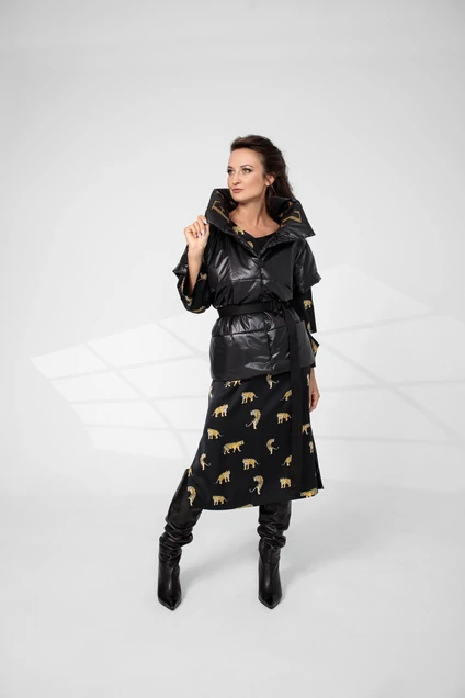 Комплект женский, состоящий из жилета и платья. Платье прямого силуэта. По переду и спинке кокетки. Нижняя часть переда со складкой по центру. Рукав втачной со сборкой по верхней части оката. Низ рукава со складкой, петлей и пуговицей. Вырез по спинке V-образный. Жилет прямого силуэта. Застежка на навесные петли и пуговицы. Перед с подрезом и карманом в нём. Пройма с манжетой. Воротник-стойка с фирменной печатью. Жилет утеплен синтепоном плотностью 100 гр. В комплекте пояс из ременной тесьмы.