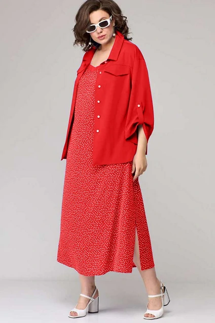 Комплект женский двухпредметный, состоящий из платья и рубашки-блузы. Платье свободного ситлуэта со спущенным плечом без рукава с нагрулными выточками по полочке, выполнено из плательного крепа друх дизайнов. По спинке центральный шов, горловина фигурная на обтачке. Декором служит подрез в виде кокетки по полочке. Рубашка-блуза прямого свободного силуэта со спущенным плечом, выполнена из однотонного плательного крепа. Вырез горловины воротник рубашечного типа без стойки, застежка до верху на обетанные петли и пуговицы. Плечо спущенное, рукав вставлен в открытую пройму. По низу рукава пата, закрепленная наверх отделочной пуговицей. В боковых швах обработаны небольшие разрезы. По полочке нагрудные выточки и декоративные клапаны. Декором компелекта служат отделочные пуговицы и дизайн ткани.