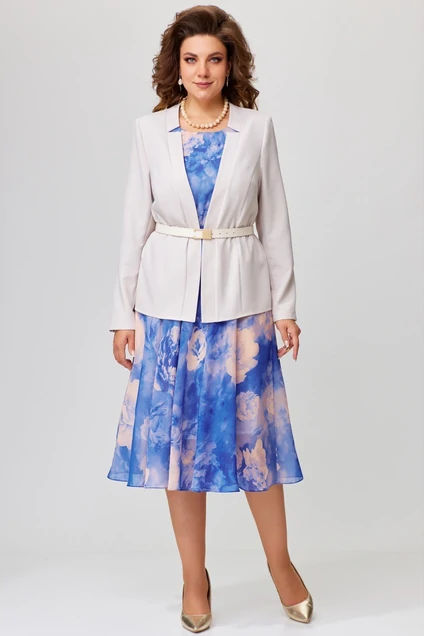 Женский комплект ВЕСЕЛИНА состоит из шифонового легкого платья и жакета без подкладки. Жакет женский без подкладки полуприлегающего силуэта без застежки. По полочке жакета рельефы из проймы, край борта и горловина обработаны притачной планкой. По спинке жакета рельефы и средний шов. рукав втачной двухшовный. Низ рукава обработан швом в подгибку с отрытым срезом. Низ жакета обработан швом в подгибку с отрытым срезом. Женское платье выполнено из нежной шифоновой ткани, на трикотажной подкладке. Юбка-платье - полусолнце. На полочке нагрудная выточка из бокового шва, линия талии слегка присобрана на резинку. Горловина платья обтачена подкладкой, рукав втачной 7/8, низ рукава присобран на резинку. Низ платья обработан швом в подгибку с закрытым срезом. В комплекте к комплекту идет пояс. платье 95% искусственный шелк, 5% спандекс