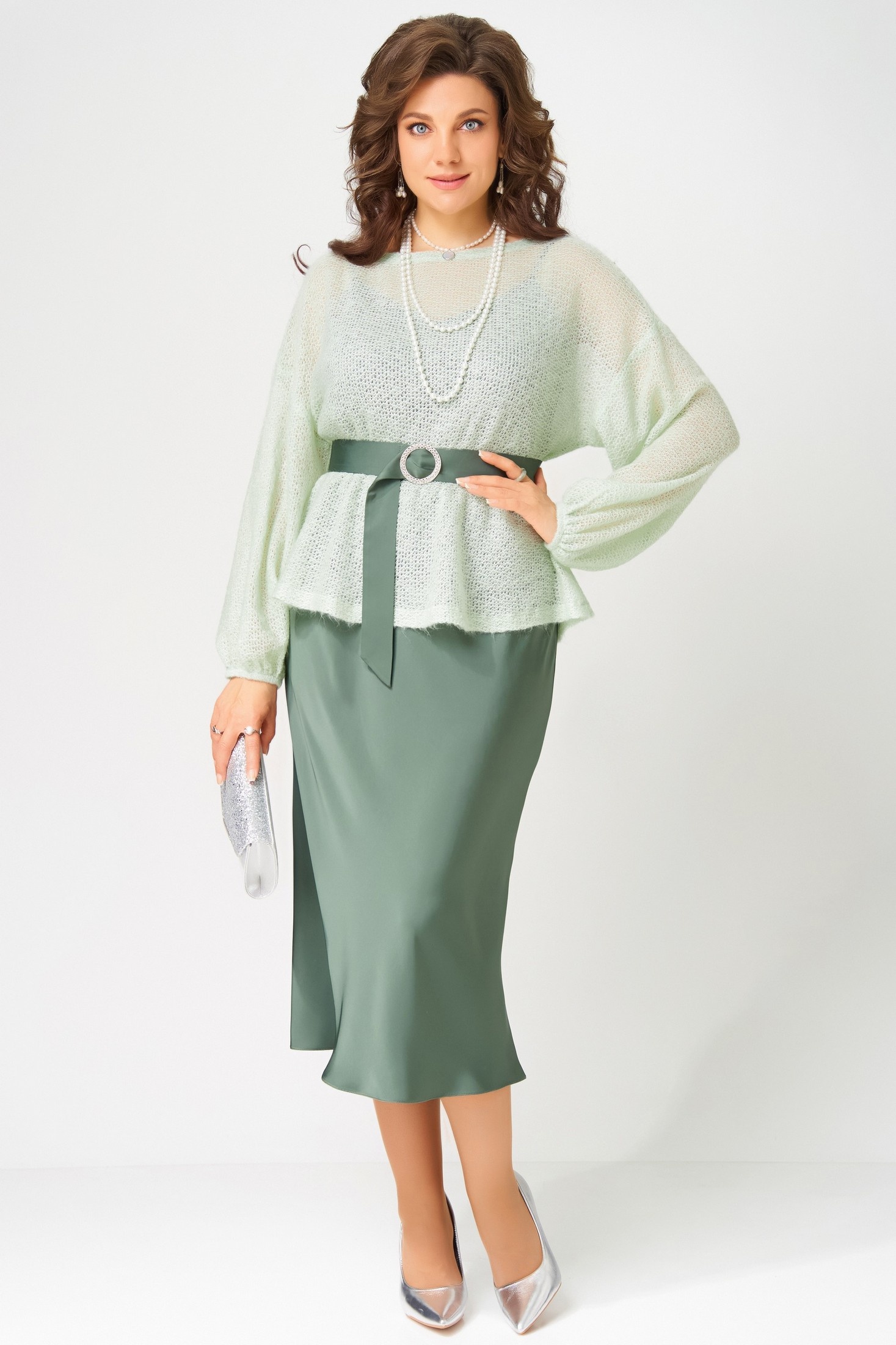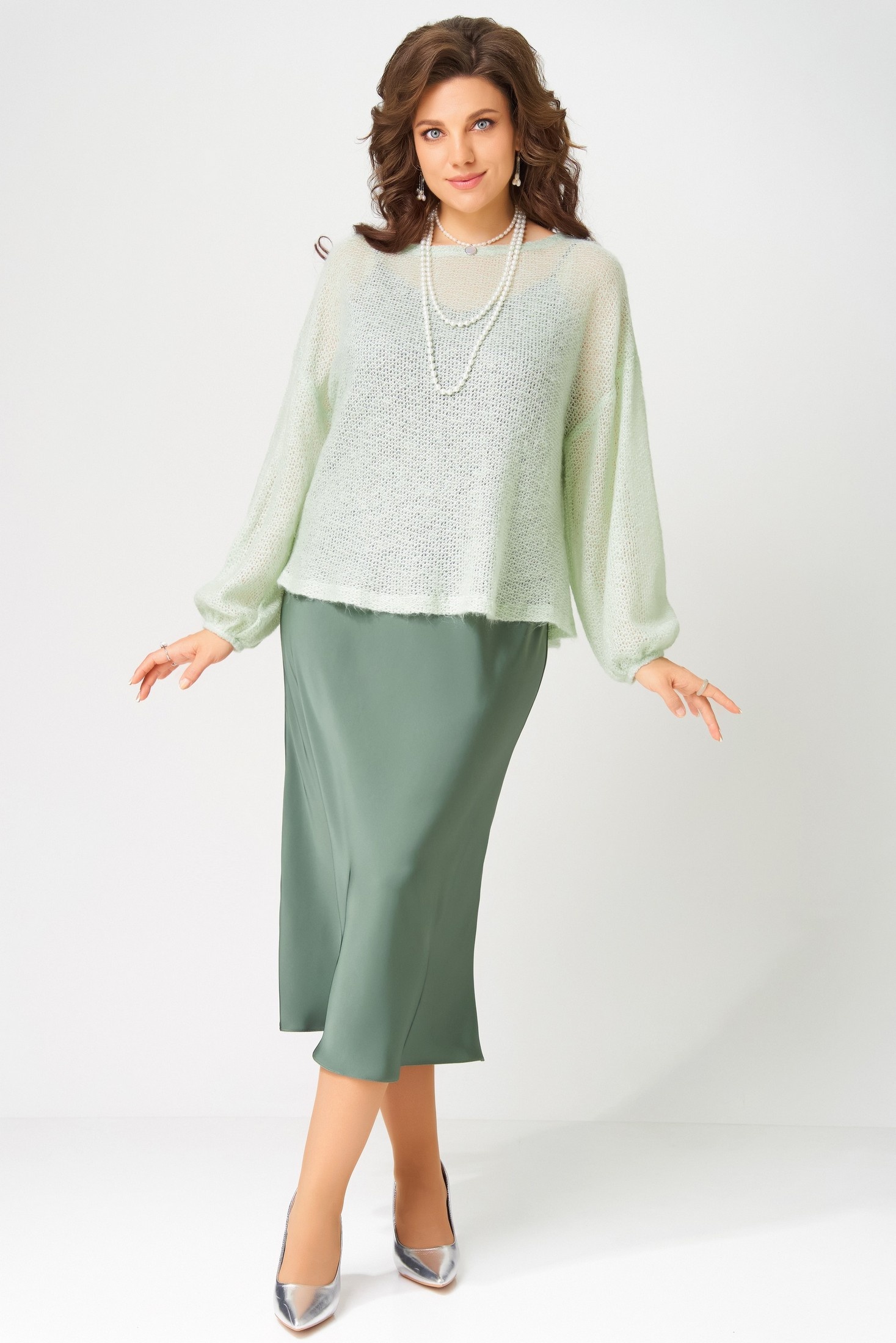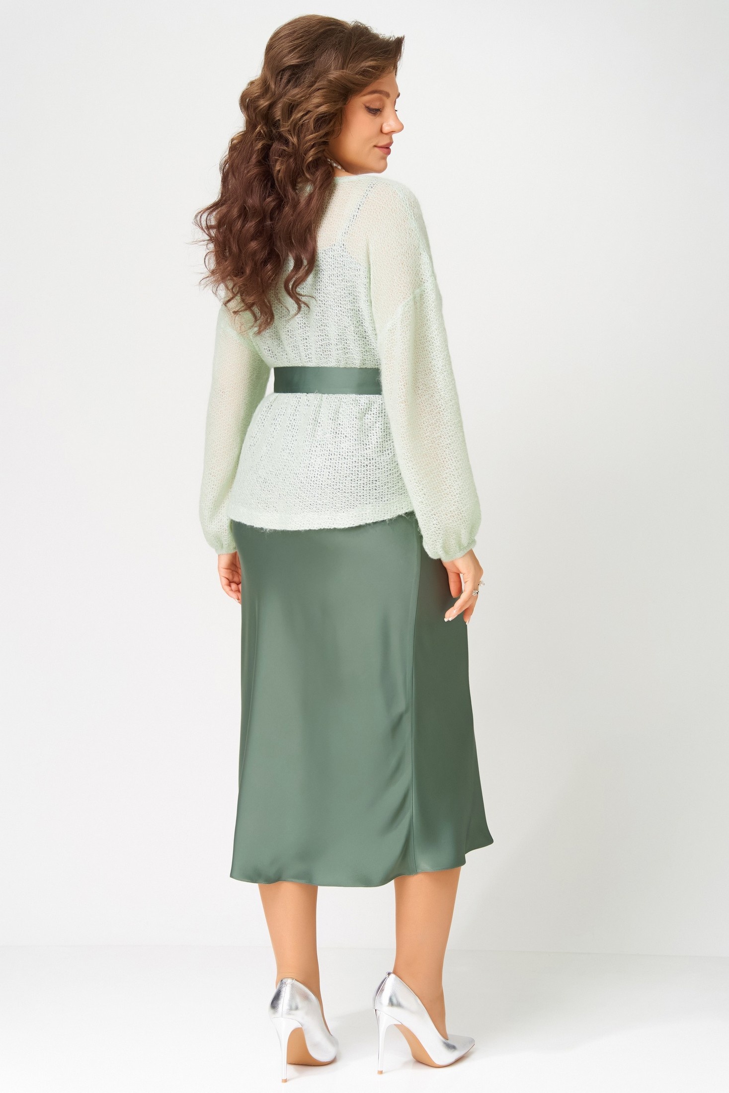 "Эдита" — элегантный образ для волшебной ночи. Сатиновое платье струится мягким блеском, а трикотажная накидка из махера с шерстью добавляет тепла и фактурности. Идеальный наряд для встречи Нового года и других торжеств, когда хочется сиять и чувствовать себя особенно.