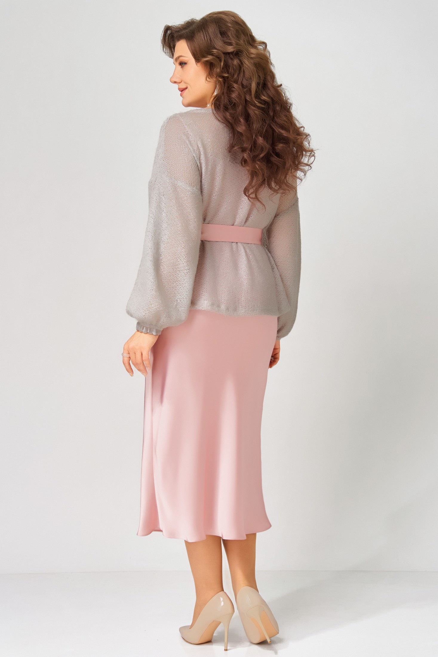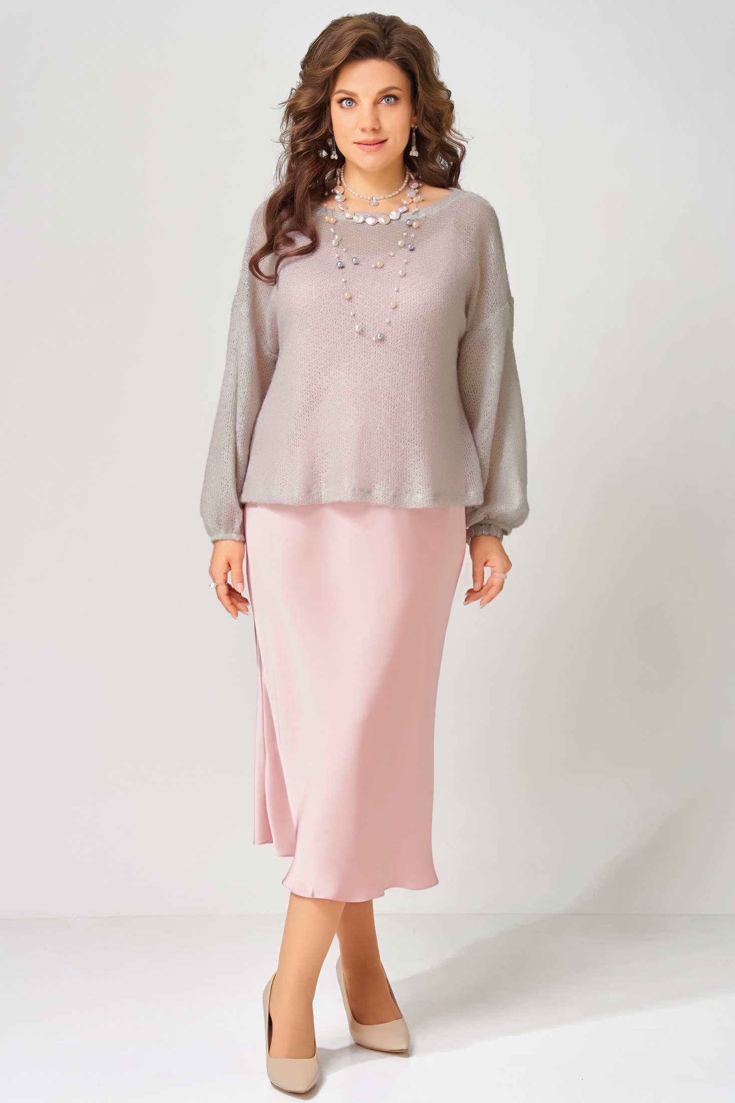 "Эдита" — элегантный образ для волшебной ночи. Сатиновое платье струится мягким блеском, а трикотажная накидка из махера с шерстью добавляет тепла и фактурности. Идеальный наряд для встречи Нового года и других торжеств, когда хочется сиять и чувствовать себя особенно.