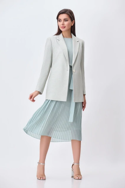 Комплект состоит из жакета и платья. Жакет полуприлегающего силуэта с однобортной застежкой на одну пуговицу и воротником пиджачного типа. Перед и спинка с рельефами из проймы. По спинке средний шов. Рукав втачной двухшовный. Жакет на подкладке. Платье прямого силуэта, отрезное по линии талии и приталеное с помощью резиночки, с юбкой плиссе. Перед с нагрудной вытачкой. В боковых швах шлевки. Горловина круглая, по спинке застежка капельна на одну петлю-пуговку. Рукав втачной со сборкой по окату и по низу с притачной манжетой с застежкой на одну петлю- пуговку. Платье на подкладке. Платье дополнено поясом из основной ткани.Фурнитура может быть изменена. Длина платья - 113 см., рукава 32 см. Длина жакета - 72 см, длина рукава - 60 см. Платье: ПЭ 100%