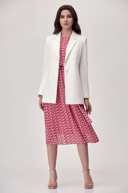 Комплект состоит из жакета и платья. Жакет полуприлегающего силуэта с однобортной застежкой на одну пуговицу и воротником пиджачного типа. Перед и спинка с рельефами из проймы. По спинке средний шов. Рукав втачной двухшовный. Жакет на подкладке. Платье прямого силуэта, отрезное по линии талии и приталеное с помощью резиночки, с юбкой плиссе. Перед с нагрудной вытачкой. В боковых швах шлевки. Горловина круглая, по спинке застежка капельна на одну петлю-пуговку. Рукав втачной со сборкой по окату и по низу с притачной манжетой с застежкой на одну петлю- пуговку. Платье на подкладке. Платье дополнено поясом из основной ткани. Фурнитура может быть изменена. Длина платья - 113 см., рукава 32 см. Длина жакета - 72 см, длина рукава - 60 см.