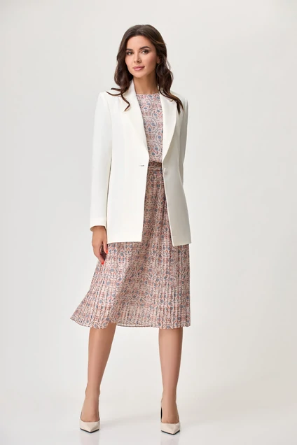 Комплект состоит из жакета и платья. Жакет полуприлегающего силуэта с однобортной застежкой на одну пуговицу и воротником пиджачного типа. Перед и спинка с рельефами из проймы. По спинке средний шов. Рукав втачной двухшовный. Жакет на подкладке. Платье прямого силуэта, отрезное по линии талии и приталеное с помощью резиночки, с юбкой плиссе. Перед с нагрудной вытачкой. В боковых швах шлевки. Горловина круглая, по спинке застежка капельна на одну петлю-пуговку. Рукав втачной со сборкой по окату и по низу с притачной манжетой с застежкой на одну петлю- пуговку. Платье на подкладке. Платье дополнено поясом из основной ткани. Фурнитура может быть изменена. Длина платья - 113 см., рукава 32 см. Длина жакета - 72 см, длина рукава - 60 см.