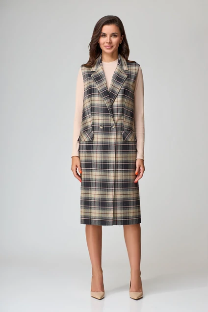 Комплект состоит из жилета и платья. Жилет прямого силуэта с пиджачным воротником и центральной двухбортной застежкой на 2 петли и 2 пуговицы. Перед с рельефом из проймы и полурельефом. Спинка со средним швом переходящим в шлицу и рельефом из проймы. По переду декоративный клапан. Жилет на подкладке. Платье полуприлегающего силуэта с втачным одношовным рукавом. воротник-стойка. Фурнитура может быть изменена. Длина жилета по спинке- 105см, длина платья по спинке-105см, длина рукава-58см. Платье: Вискоза-95%, Лайкра-5%, .
