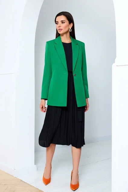 Комплект состоит из жакета и платья. Жакет полуприлегающего силуэта с однобортной застежкой на одну пуговицу и воротником пиджачного типа. Перед и спинка с рельефами из проймы. По спинке средний шов. Рукав втачной двухшовный. Жакет на подкладке. Платье прямого силуэта, отрезное по линии талии и приталеное с помощью резиночки, с юбкой плиссе. Перед с нагрудной вытачкой. В боковых швах шлевки. Горловина круглая, по спинке застежка капельна на одну петлю-пуговку. Рукав втачной со сборкой по окату с притачной манжетой с застежкой на одну петлю- пуговку. Платье на подкладке. Платье дополнено поясом из основной ткани. Длина платья - 113 см., рукава-62 см. Длина жакета - 72 см, длина рукава - 60 см. Платье: ПЭ-100%