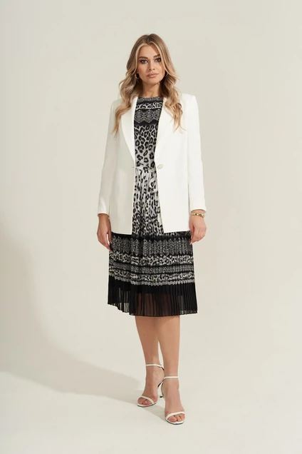 Комплект состоит из жакета и платья. Жакет полуприлегающего силуэта с однобортной застежкой на одну пуговицу и воротником пиджачного типа. Перед и спинка с рельефами из проймы. По спинке средний шов. Рукав втачной двухшовный. Жакет на подкладке. Платье прямого силуэта, отрезное по линии талии и приталеное с помощью резиночки, с юбкой плиссе. Перед с нагрудной вытачкой. В боковых швах шлевки. Горловина круглая, по спинке застежка капельна на одну петлю-пуговку. Рукав втачной со сборкой по окату с притачной манжетой с застежкой на одну петлю- пуговку. Платье на подкладке. Платье дополнено поясом из основной ткани. Длина платья - 113 см., рукава-62 см. Длина жакета - 72 см, длина рукава - 60 см.