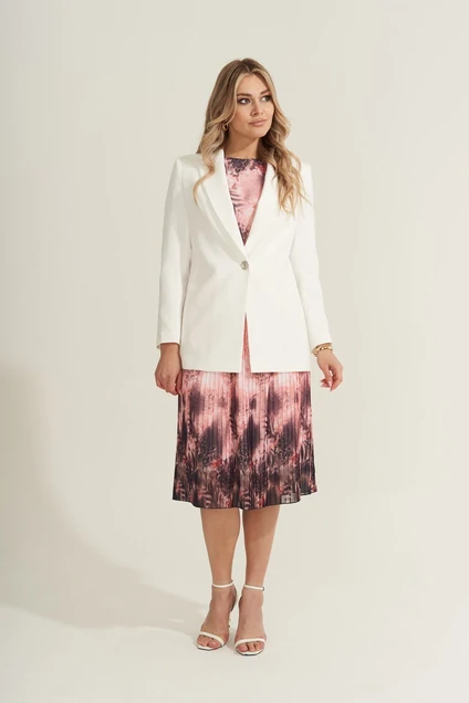 Комплект состоит из жакета и платья. Жакет полуприлегающего силуэта с однобортной застежкой на одну пуговицу и воротником пиджачного типа. Перед и спинка с рельефами из проймы. По спинке средний шов. Рукав втачной двухшовный. Жакет на подкладке. Платье прямого силуэта, отрезное по линии талии и приталеное с помощью резиночки, с юбкой плиссе. Перед с нагрудной вытачкой. В боковых швах шлевки. Горловина круглая, по спинке застежка капельна на одну петлю-пуговку. Рукав втачной со сборкой по окату с притачной манжетой с застежкой на одну петлю- пуговку. Платье на подкладке. Платье дополнено поясом из основной ткани. Длина платья - 113 см., рукава-62 см. Длина жакета - 72 см, длина рукава - 60 см.